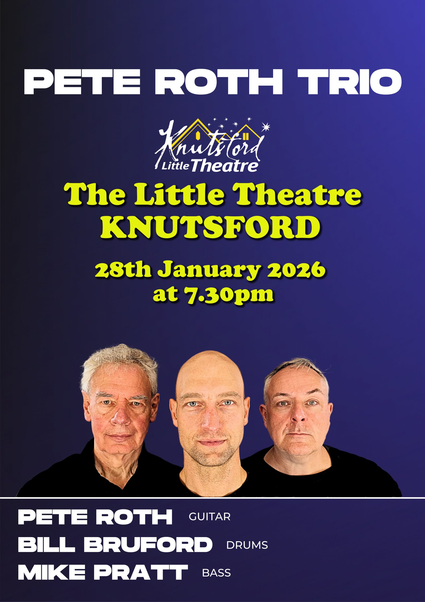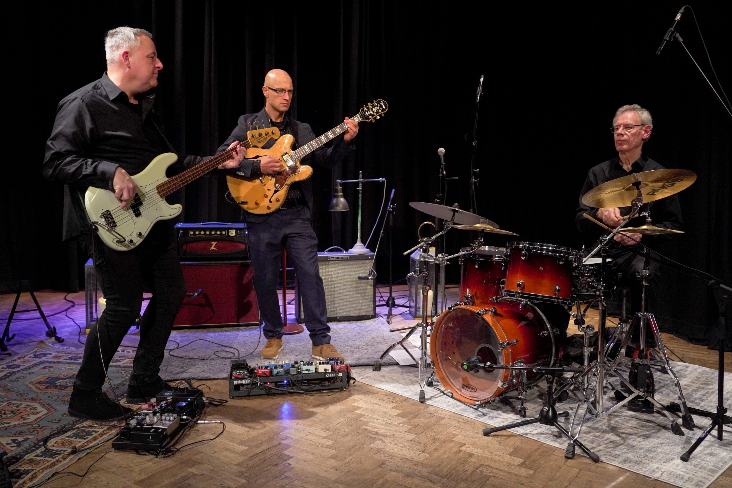 The Pete Roth Trio features leader Pete on guitar, Mike Pratt on bass, and the incomparable Bill Bruford on drums. The band creates jazz for a new generation of music enthusiasts, exploring beyond traditional jazz conventions. A jazz standard might reveal its essence only in the final moments of performance. Roth’s original compositions, such as “Dancing with Grace,” the Trio’s collaborative works like “Trio in Five” and “Looking Forward to Looking Back,” or their reinterpretation of masterworks like Anton Dvorak’s “Largo from Symphony #9,” offer just a few gateways into the creative world of the Pete Roth Trio—a world that will likely reshape your perspective on what the guitar trio format can achieve.